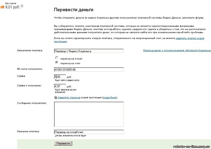Выберите перевод на e-mail (если вам известен e-mail получателя) или перевод на счет (если вам известен счет вида 41001*********). Заполните такие поля: * Назначение платежа (можно не изменять)