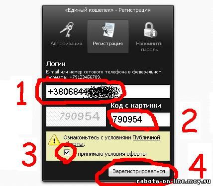 Для регистрации кошелька достаточно указать в поле «Логин» номер сотового телефона в международном формате (например: +38(050)123-45-67) или адрес электронной почты (например: ivanov@mail.ua), а также защитный код с картинки, после чего поставив галочку, принять условия публичной оферты.